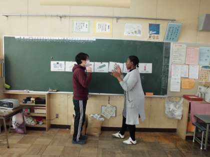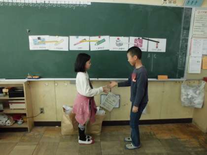 写真は「英単語陣取りじゃんけん」をしているところです。先生が見本を見せてから開始です。
