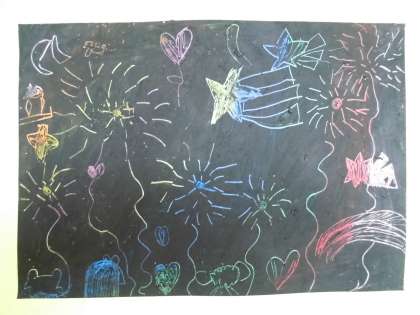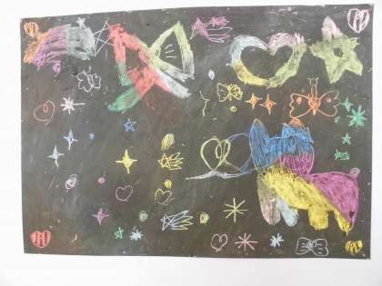 色を重ね塗りし、割箸で絵を描きながら、出てきた色を楽しみます。