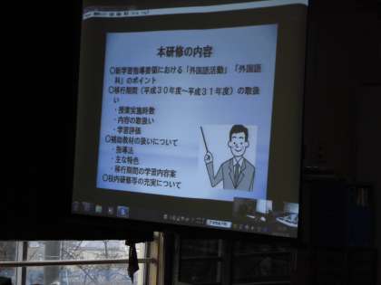3月8日、外国語活動の研修会が、本校パソコン室で行われました。教育センターをメイン会場として行われている研修会を、インターネットで結び、サテライト会場として、他校の先生方も参加し、研修しました。