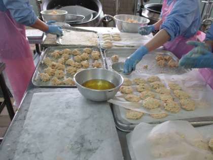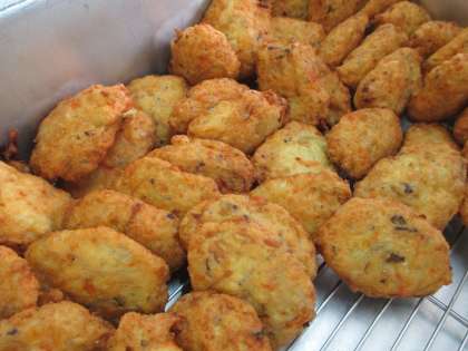 とうふのまさご揚げは とうふ、えび、ちりめんじゃこ、やさいを混ぜあわせ、小さく丸めて油で揚げます。
