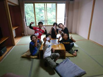 雨にもあわず、渋滞にもあわず、行動も素早、予定よりも40分も早く宿舎に到着しました。部屋レクしながら、一休みです。天気が心配ですが、ホテルの真上は青空です。キャンプファイヤーができますように。