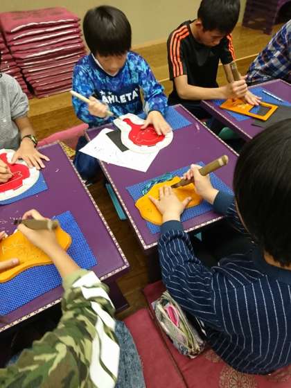 《引っ掻き刀》という手前に引いて使う特殊な彫刻刀を使って彫ります。(東照宮の彫刻を塗り直す際、劣化した漆を剥がすために使った道具が引っ掻き刀の元だそうです)