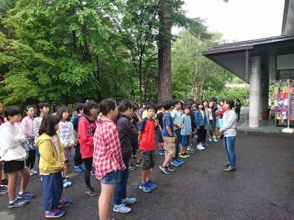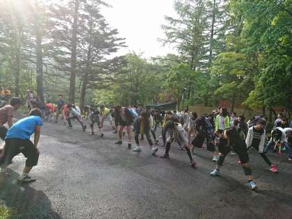外の気温は14度。とても爽やかな3日目の朝です。昨日の疲れが残っていそうな子供たちですが、体操をして元気回復。これから源泉へ朝の散歩です。