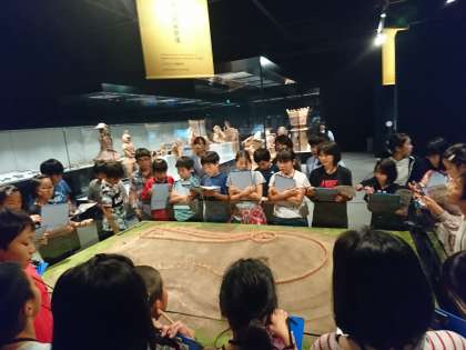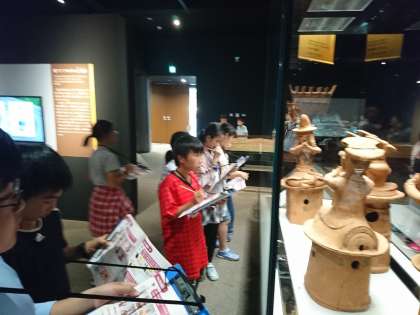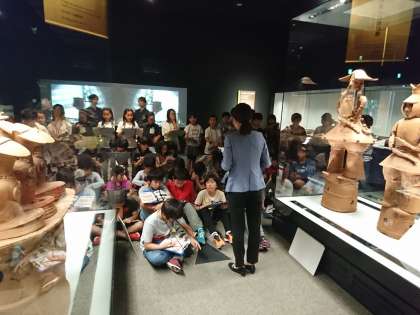 埴輪探険がスタートしました。実際の埴輪が思った以上に大きくびっくり。学芸員の方から説明を受けたあと、ワークシートのクイズの答えを探すため、展示物を真剣に鑑賞しています。 14:11