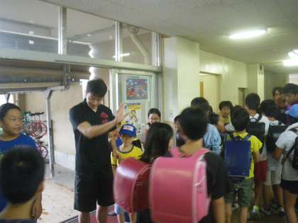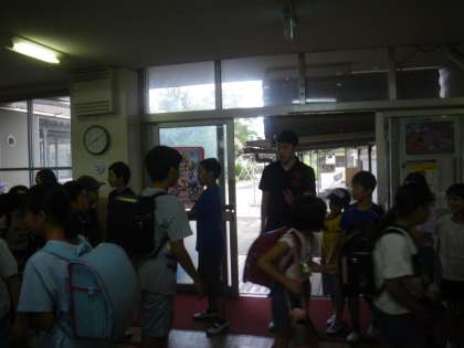 子供たちは背の大きな選手にびっくり!ハイタッチをしたり、握手をしたりしてあいさつをしていました。朝から笑顔の子供たちです。【副校長】