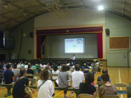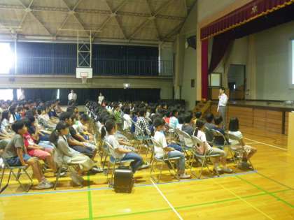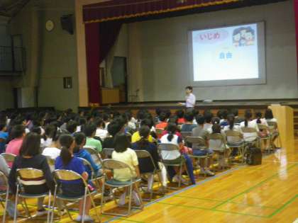 いじめの構造をわかりやすくイメージ化してお話してくださり、実際にいじめで自殺してしまった方の話から、いじめをどうすれば防げるのか、辛い友達を救うことができるのか考えさせていました。子供たちの心に響いたと思います。【副校長】