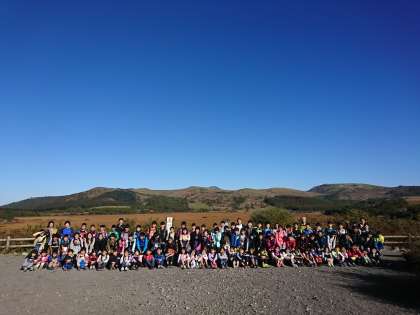 全員写真をとりました 湿原の紅葉と空の青がマッチしています