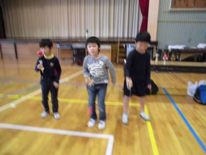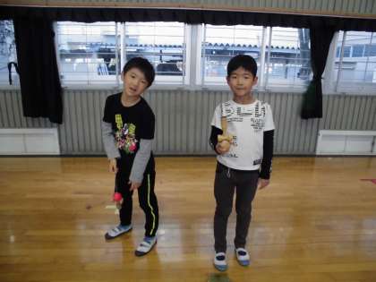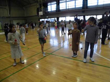2年生の学年行事が行われました。2人のけん玉名人が楽しい技を見せてくれました。その後は10人ずつの輪になって、空中ブランコや野球など、教えてもらった技を練習しました。【2年担任】