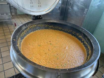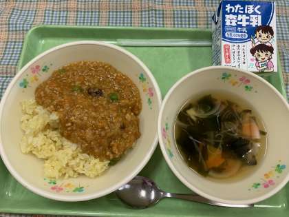 550人分のドライカレーが釜に出来上がりました。低学年に合わせて、甘めのカレーです。感染症対策で、給食時間は班を作らずおしゃべりしないで静かに食べますが、ごちそうさまの後で「おいしかったです」と声掛けしてくれる子もいました。