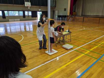 いつもなら4月当初に行う計測です。2か月遅れですが、ようやく行うことができました。しかし、「3密」を避けるために、保健室ではなく体育館で行いました。