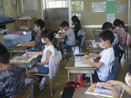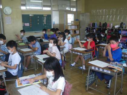 身近な椚田小周辺の学習から始めます。白地図に自分の知っていることを書き込んでいました。4年生と同じく東西南北を使って記入しました。【副校長】