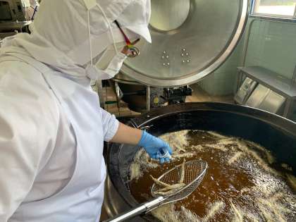 画像二枚目は、ししゃもの中心温度を確認しているところです。からっと揚げて油から引き上げる直前に測ると、95度くらいまで上がっていました。