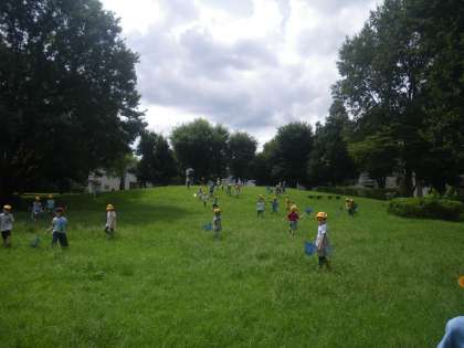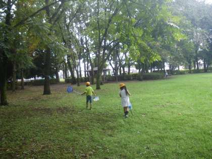 バッタ、トンボ、チョウ、ガ、キリギリスなどたくさんの虫を見つけて、虫かごに入れて学校に戻りました。広い公園の中を黄色い帽子の子供たちが虫を追いかけて走り回っていました。