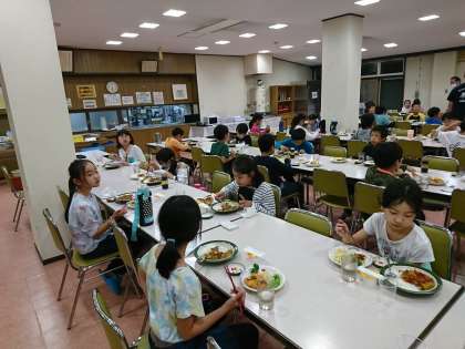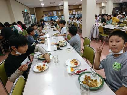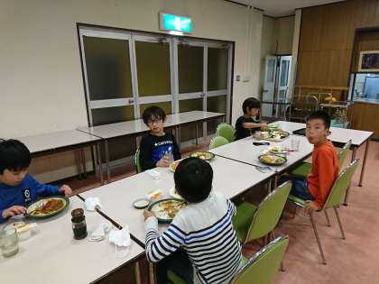食事の様子です 美味しいカレーライスです 野菜やチキンカツも残さず食べられるかな?いただきます【副校長】