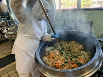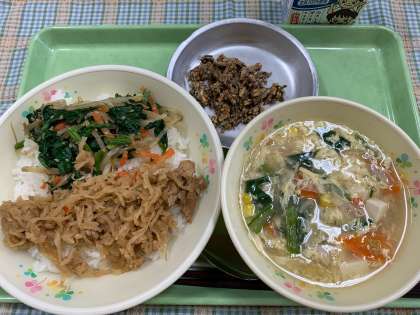ビビンバは、豚肉と切り干し大根の炒め煮と、野菜のナムルの二色どんぶりです。豚肉のうまみをたっぷりと吸わせた切り干し大根は、ごはんに合うように柔らかめに煮ました。具を二種類ものせたどんぶりなのでボリュームがありますが、残菜率は4%でよく食べていました。