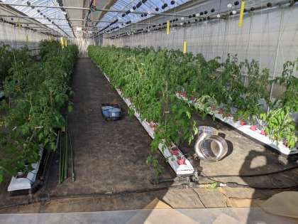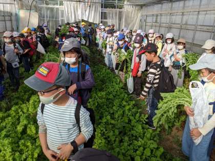 見学の終わりに、ビニルハウスでのトマト栽培の様子も見せてもらいました。