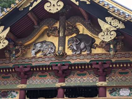 さて、最初の彫刻が見えてきました。「想像の象」です。文字どおり見たこともなく想像で描いたものですが、なんとなく象に見えますよね。