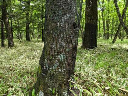 2枚目の写真は、その鹿が木の皮を食べてしまい、それが元で木そのものが立ち枯れしてしまうことがあるために、鹿に食べられないようにガードする網が巻いてあるものです。