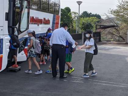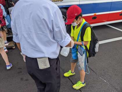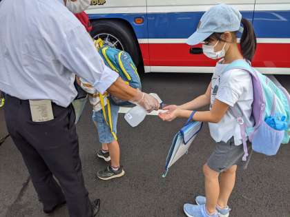当たり前ですが、子供たちだけでなく、先生も乗車時には消毒をします。
