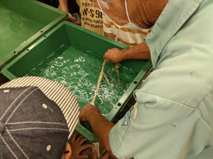 まずは、コウゾを水の中で広げ、小さなゴミなどがあるようなら取り除く工程(チリヨリ)を見せてくれています。