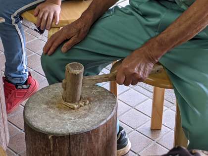 きれいにしたコウゾを、今度は木槌で叩きます。かたい繊維を柔らかくするためです。