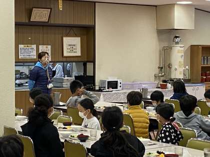 いただきますの前に、川?先生よりありがたいお話をいただきました。この移動教室をとおして、ふだんの生活で当たり前になっていることは、実は誰かの支えがあること。当たり前と思うことでも、相手への感謝の気持ちを大切にし、その感謝の気持ちを相手に伝えていきたい。というお話でした。