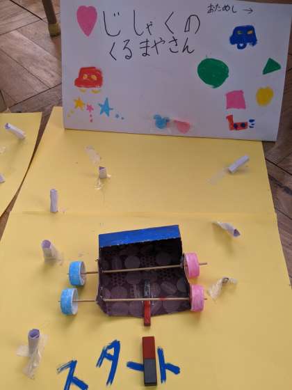 手作りおもちゃで遊びながら、より良いものを目指して、改良や工夫をするために、付箋を使ってアドバイスし合ったり、もらった意見を参考にして話し合ったりしています。