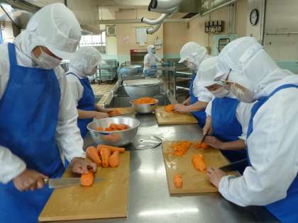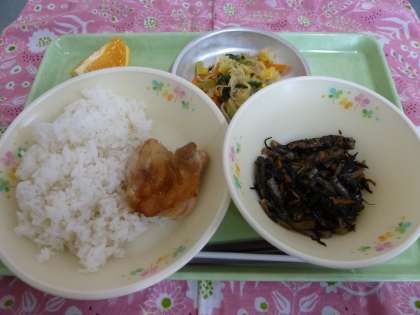 今月から月に一度、主食・主菜・副菜・乳製品・果物の五つが揃った献立が登場します。今日は「骨を作る・強くする」ことにスポットを当てた献立でした。骨を作り、強くするには、カルシウム・たんぱく質・ビタミンをバランスよく摂取することが大切です。毎日飲んでいる牛乳に加えてカルシウム満点のちりめんじゃこ、ひじきをふんだんに使いました。ひじきの炒め煮はどの子もモリモリ食べてくれていました。特に1年生は残りもほとんど無く、苦手な子も励ますと一口、頑張って食べることができました。給食室では野菜の切り方や大きさを食べやすいように工夫しています。しっかり食べてくれてとても嬉しく思います!これからも自分に合った量は残さず食べて、丈夫な体を作りましょう。