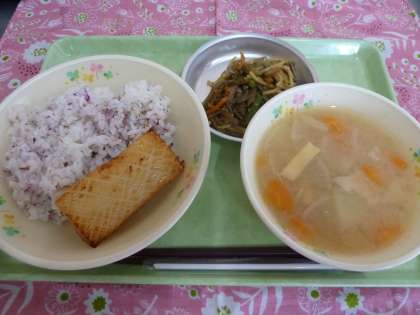 かわりきんぴらはきんぴらごぼうにスパゲティを入れたものです。きんぴらが苦手でもなぜかこれは大好き、という子が多いです。今日もしっかり食べてくれました。