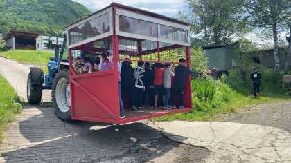 通常は野菜を運ぶトラクターに、野菜になったつもりで運ばれます。