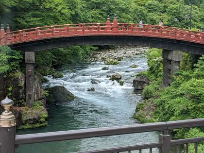 色鮮やかな赤い橋は、「神橋」といいます。過去にこの橋の上で結婚式をあげているのを見たことがあります。