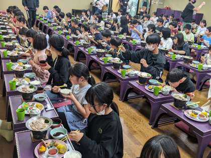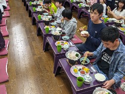 自分でよそうのではなく、手を上げて係の人にもらいます。