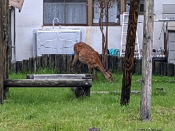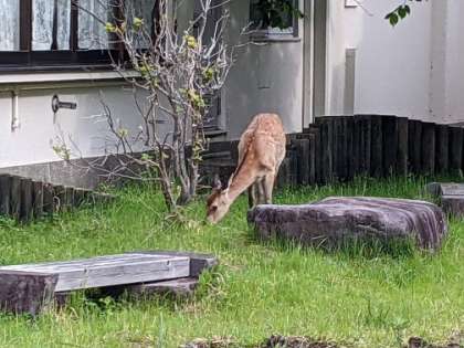 朝の散歩で、宿舎に戻る途中のミニ公園に、かわいい二頭のシカが草をはんでいました。