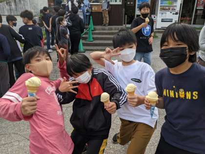 カウンターからアイスクリームを受け取った子供たちは、喜びすぎて落とさないようにしなければなりません。