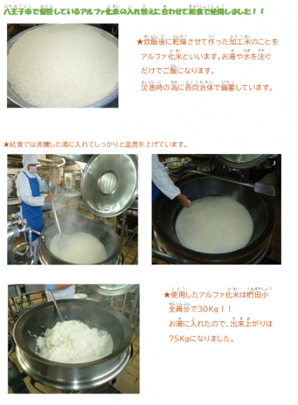 今日の給食はアルファ化米を食べました。例年、八王子市で保管されているアルファ化米の入れ替えに合わせて給食で使用しています。アルファ化米は水や湯を入れるだけで食べられるので災害に備えて八王子市でも備蓄しています。ご家庭でも災害時の備えについて話し合うきっかけにしていただければと思います。