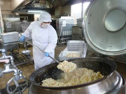 ピラフは洋風の炊き込みご飯のことです。生のお米と具を炒めてスープを入れて炊きます。給食ではその調理法だと火が通らないので、ごはんと具を別々に作り上げて後から混ぜます。少ししっとりめのおいしいピラフになりました。