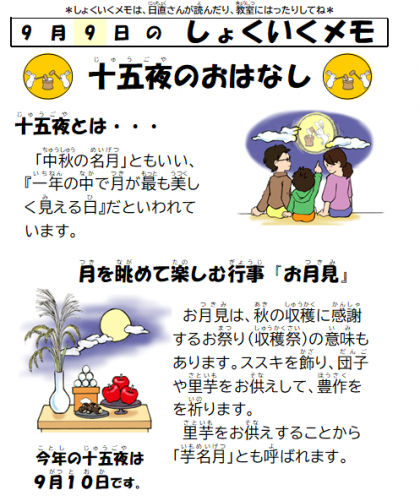 9月10日は十五夜です。給食では1日早いのですが、お月見の献立を作りました。十五夜とは旧暦の8月15日のことで、1年のうちで1番、月がきれいに見えるといわれています。十五夜には農作物の豊作を祈り、稲穂に見立てたすすきやお米で作っただんごをお供えします。明日の天気はどうでしょうか。きれいな月が見えるといいですね。