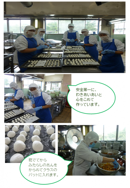 給食のおだんごは白玉粉を豆腐といっしょに練ってひとつひとつ丸めて作りました。まん丸で、みたらしのあんと合わせると夜空に浮かぶお月様のようでした。