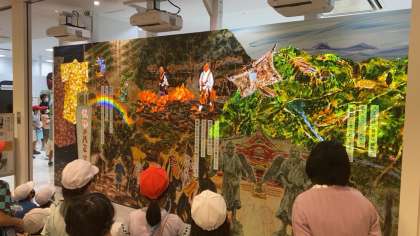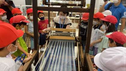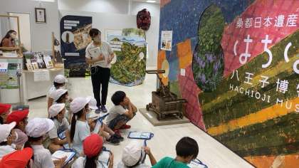 博物館の方のお話や絹織の実演、八王子が「桑都」と呼ばれる所以となったことについてのプロジェクションマッピングなどを見ています。