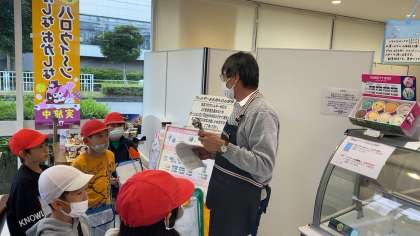 名前の由来、一番人気のあるアイスクリーム、種類の数、使ってる道具のことなど、子供たちが教室で考えてきた質問をします。どの子もはっきりとお話ができています。教室で質問をする練習をしてきたことが生きています。見学へ行く前の教室での事前の学習もとても大切です。