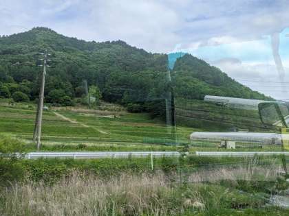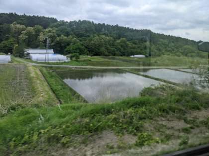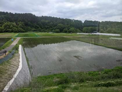 少し遠めで分かりづらいですが、稲作の水田です。植えて間もない時期だと思いますが、見事に列を成して植えられていますね。