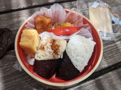 おぎのやで受け取ったおにぎり弁当です。シンプルながらも、とてもおいしそうです!