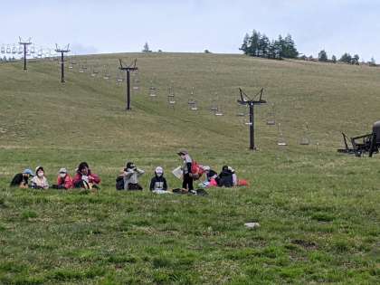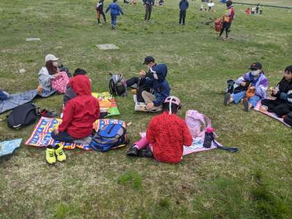 思い思いのグループで食べ始めます。このあとのハイキングに向けて、エネルギーチャージですね。