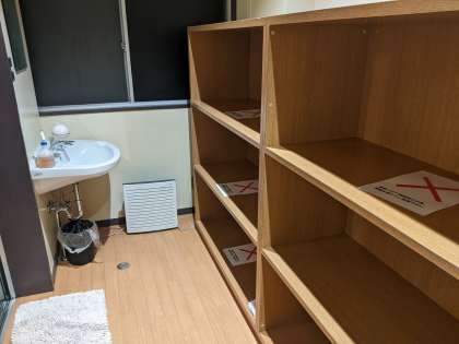 中に入ると脱衣所があります。新型コロナウイルス感染症の感染拡大防止対策の名残でしょうか、ロッカーの真ん中は使用禁止のバツ印が見えますね。