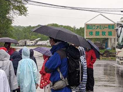 まずは、トラクター乗車体験をするために、カッパを着て移動します。