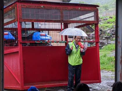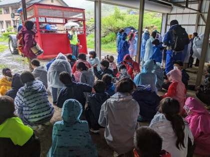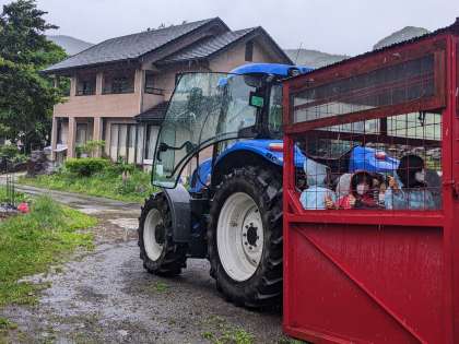 雨が避けられる建物の下に入り、トラクター乗車体験のための説明を聞きます。