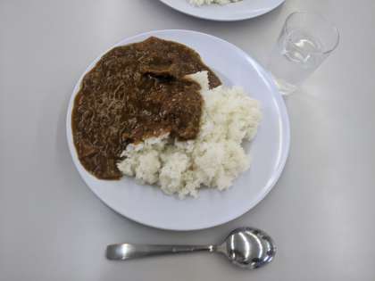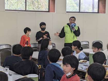 係の子の挨拶の前に、鷹山ファミリー牧場の方による動物の命のお話がありました。「牛は人間のために乳を出しているのではなく、自分の子牛のために出している」「このカレーライスの中にも牛肉が入っているので、その命に感謝して食べてほしい」などのお話でした。