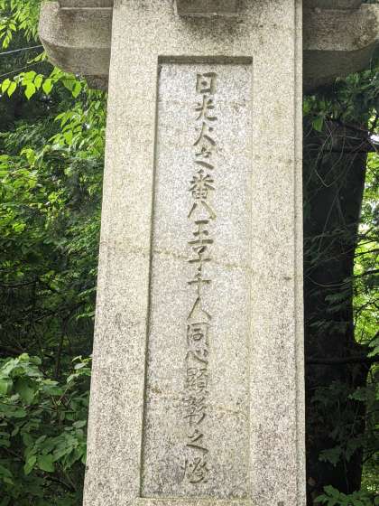 そう、西八王子駅周辺の千人町に関連する「八王子千人同心」の文字が彫られています。江戸時代に八王子千人同心が日光東照宮などの火の番を勤めた縁で、昭和49年に八王子市と日光市は姉妹都市の盟約を結んだ、とのことです。