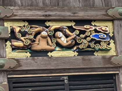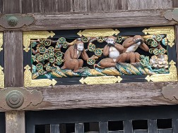 全部で8枚ありますが、左から2枚め(この写真でも2枚め)が、かの有名な「三猿」(見ざる、言わざる、聞かざる)です。
