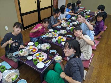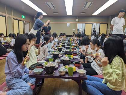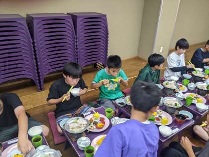 友達と楽しそうに会食しています。ただし、この数年の学びを生かし、大声を出したり、食べながら話たりする子はいません。
